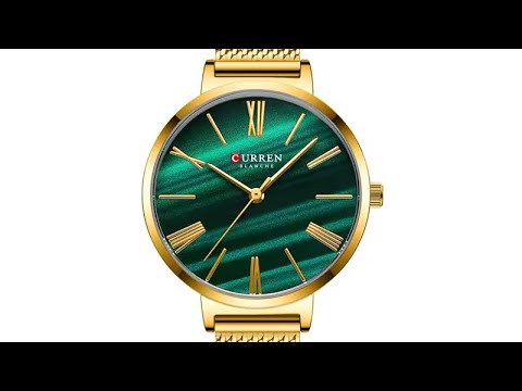 Curren 9076 Ladies Mesh Chain Watch- Green Dial- Golden Bezel- Golden Chain- TF Code CR353CF